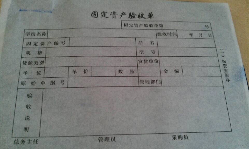 应填入固定资产验收的时间,验收的固定资产的品名、规格、型号,单位,单价,数量,金额,管理部门,采购员,并有验收合格的说明,固定资产管理员的签名和总务主任的签名。