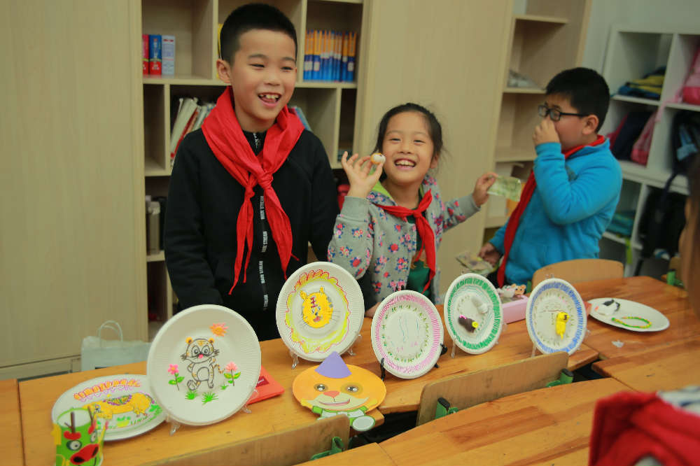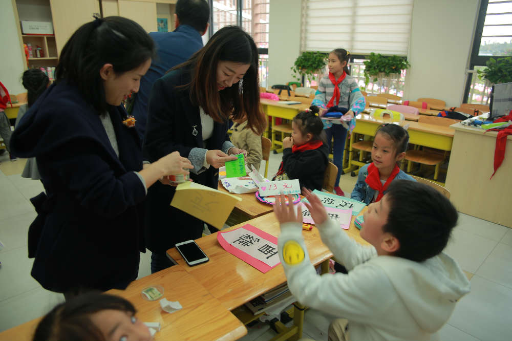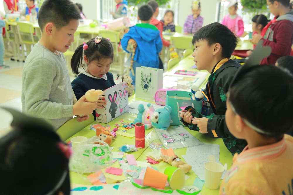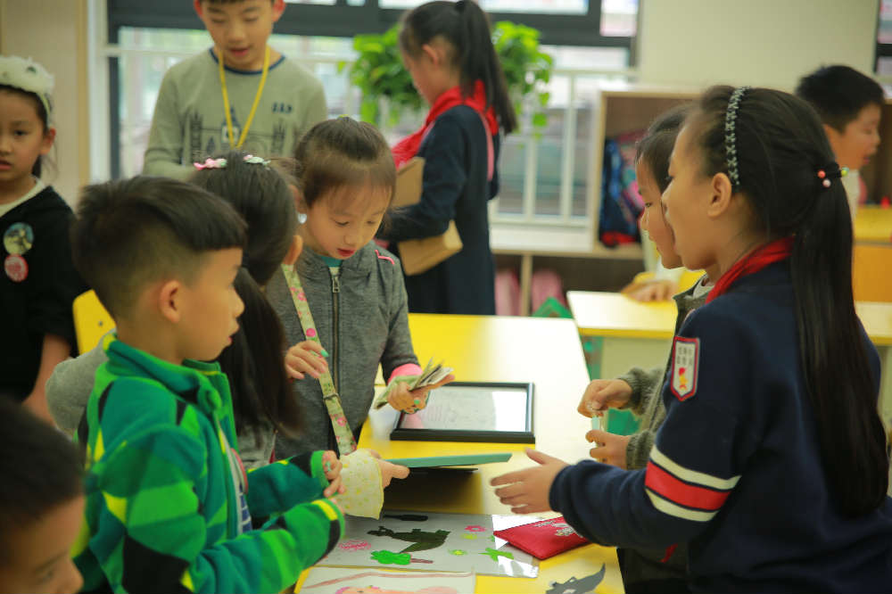 活动分为A、B两场,每场45分钟,A场结束后卖家、买家互换身份。10日下午1点,生肖市场正式开市,柜台前人头攒动,“售货员”热情地招揽着前来选购的“顾客”,同学被琳琅满目的商品所吸引,争相购买着自己喜欢的物品。整个活动现场热意涌动,每个班级的促销手段层出不穷:加1元赠棉花糖、2元大抽奖、双11大促销,小朋友们也是舌灿莲花,努力推销自己制作的商品,每个摊位都吸引了许多同学、老师、家长。