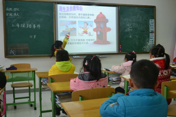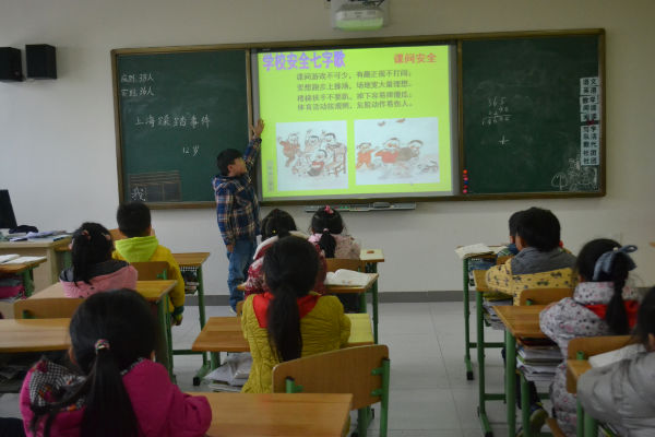 活动中,各班首先结合上海市2015年元旦迎新年踩踏事件的鲜活事例,让学生充分发表自己见解,并向孩子们出示了一组数据:据有关调查显示,我国中小学生因意外死亡的人数平均每天就有四十多人,这意味着每天就有一个班级的学生消失,让孩子们初步认识到安全知识学习的重要。接着,利用PPT,图文并茂地向孩子们讲解了校园安全的防范:进出教室要有秩序、不要推挤;上下楼梯时尽量靠边行走、不要奔跑;在教室和走廊奔跑、追逐玩耍容易发生意外,并带领孩子们拍手诵读学校课间安全七字歌: