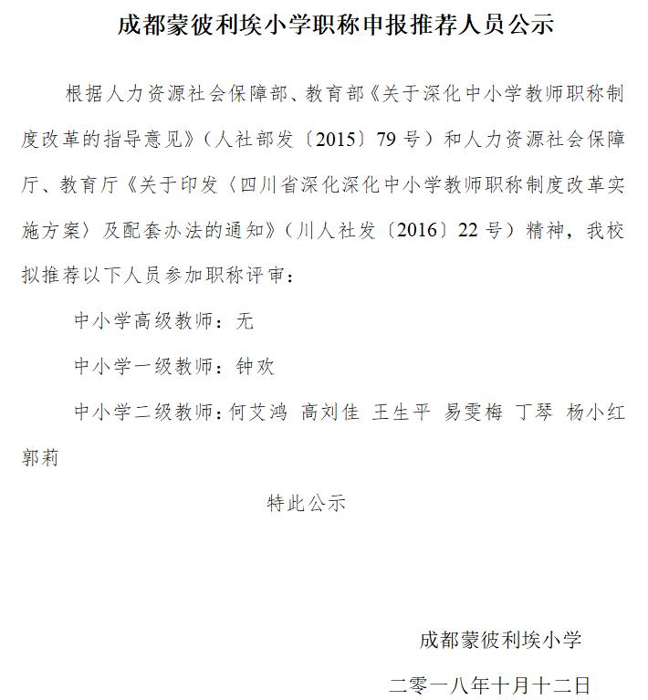 成都蒙彼利埃小学职称申报推荐人员公示