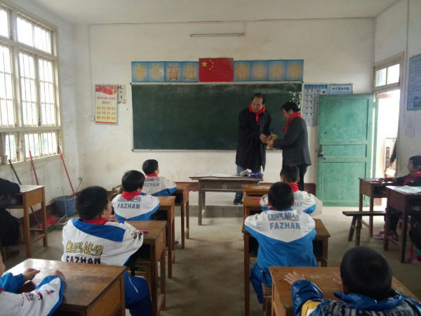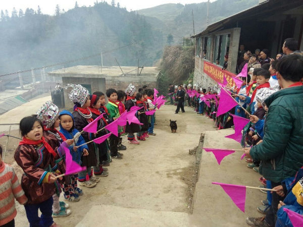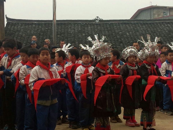 3月26日,公益队伍带着用爱心善款购买的书包、雨靴、书本等爱心物资,乘坐2个半小时的汽车,颠簸着来到三江侗族自治县独峒乡牙戈小学。这所仅有70名学生、4名老师、1名校长的乡村学校格外偏僻,下车后公益队伍还步行十多分钟的泥泞山路,才能看到一座简单的仅三层的教学楼,孩子们穿着节日时才穿的盛装,已近退休的俞校长和质朴的老师们夹道欢迎,乡里的爷爷们也穿上节日盛装,吹起了芦声,跳起了芦舞,他们用最隆重的方式、最质朴的方式,表达了对客人的欢迎与感谢!