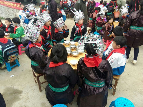 一个个忙碌的身影在操场上不停地穿梭着……一会儿功夫,桌上摆满了热气腾腾的饭菜:一份蕨菜,一份白菜,一份鸡肉和一份黄豆炒鸡蛋!每桌围坐了十多个孩子。在孩子的邀请下,我也加入到他们就餐队伍中。他们谦让有礼,特别友好,虽然有的孩子非常腼腆,但对我们却甚为照顾。通过交谈,我得知今天这样的“盛宴”是他们过年时才能上桌的美食,也许他们特别想大快朵颐,但他们却相互夹菜,互相照顾。这里的老师和村民都非常的朴实和热忱,他们由校长带头,为每一个客人献上家乡的米酒,送上最真诚的祝福!