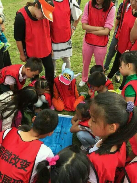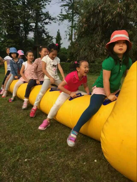 大家分为两组,各自取了张狂的名字,宇宙队和勇士无敌队,做好各自的队旗、口号和队服,骑上毛毛虫的奔跑开始了。宇宙队赛前气势轩昂,咄咄逼人,赛中却一路落后,看似简单的毛毛虫,怎么也不听使唤,鼓足所有的劲头,他就是不向前挪步,勇士队不温不火,毛毛虫却有条不紊的步步前行,宇宙队突出绝招,毛毛虫腾空而起,不再爬行,如飞般一下追上了勇士队,呵…呵…,就在大逆转的关键时刻,裁判判宇宙队犯规,停赛30 秒,终于等待世上最长的红灯变绿了,宇宙队的眼睛也绿了,勇士队已经又领先一大截,2个来回宇宙队进入状态,掌握了爬的要领,赶上了勇士队的当口,勇士队也急得飞起来,裁判又是一个停赛哨,啊…哈…,勇士队只有揪心的在终点线前5米处休息等待,宇宙队又燃起埋头追赶的激情,就在两队并列的位置,停赛解除,宇勇两队几乎同时挺过终线,裁判判勇士队以微弱优势顽胜,大家以矿泉水互贺胜利。大孩子也变成了小孩子,好久没有这么放纵了,我们的爸爸妈妈。