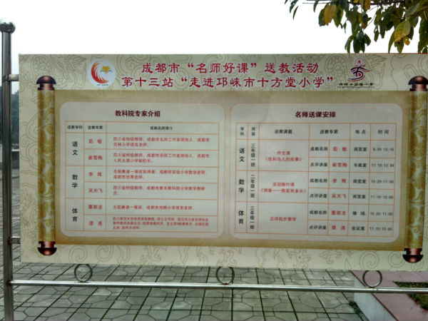 2015年11月27日,我校体育教师应邀参加了成都市教育局主办的“名师好课”送教下乡活动,走进邛崃十方堂小学,在送教过程中,我校体育教师展示了新理念下的足球课堂教学模式,得到了当地教师的好评,在课堂展示完后,又和当地的教研员、教师和专家针对体育的课堂教学进行了深入交流。