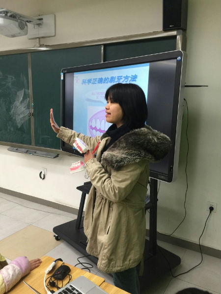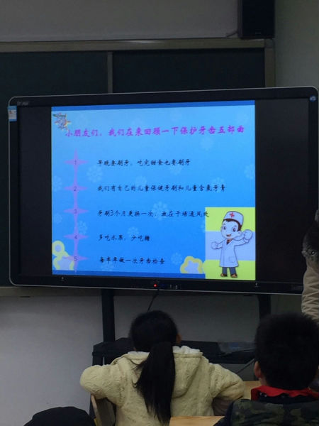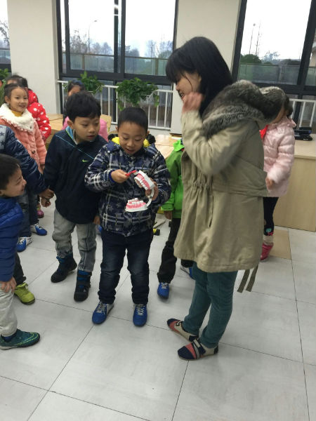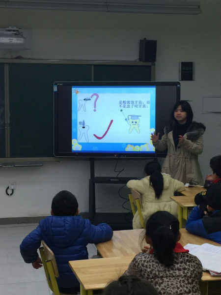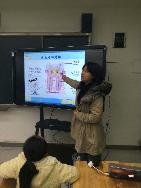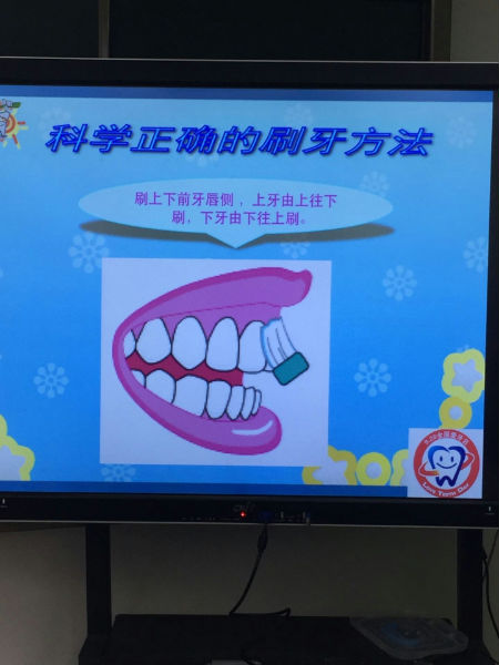 咦?究竟发生了什么有趣的事情呢?原来小朋友正在静听专家有关“爱牙护牙”的知识讲座。这个专家阿姨来自华西口腔医学院的医生。今天讲课的是四川大学华西口腔医院预防口腔科的医生程立博士,主攻儿童牙齿预防研究方向。专家通过生动的画面,形象地讲述了蛀牙的形成、科学正确的刷牙方法、口腔有多少颗牙、牙的内部结构、健康牙齿标准等。