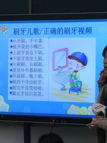 宁静的校园里,蒙小二年级一班(彩色蜗牛家园)的教育里传来朗朗的诵读声:小牙刷,手中拿。张开我的小嘴巴,上面牙齿往下刷,下面牙齿往上刷,左刷刷,右刷刷,里里外外都刷刷。早晨刷,晚上刷,刷得干净没蛀牙。刷完牙齿笑哈哈,露出牙齿白花花。
