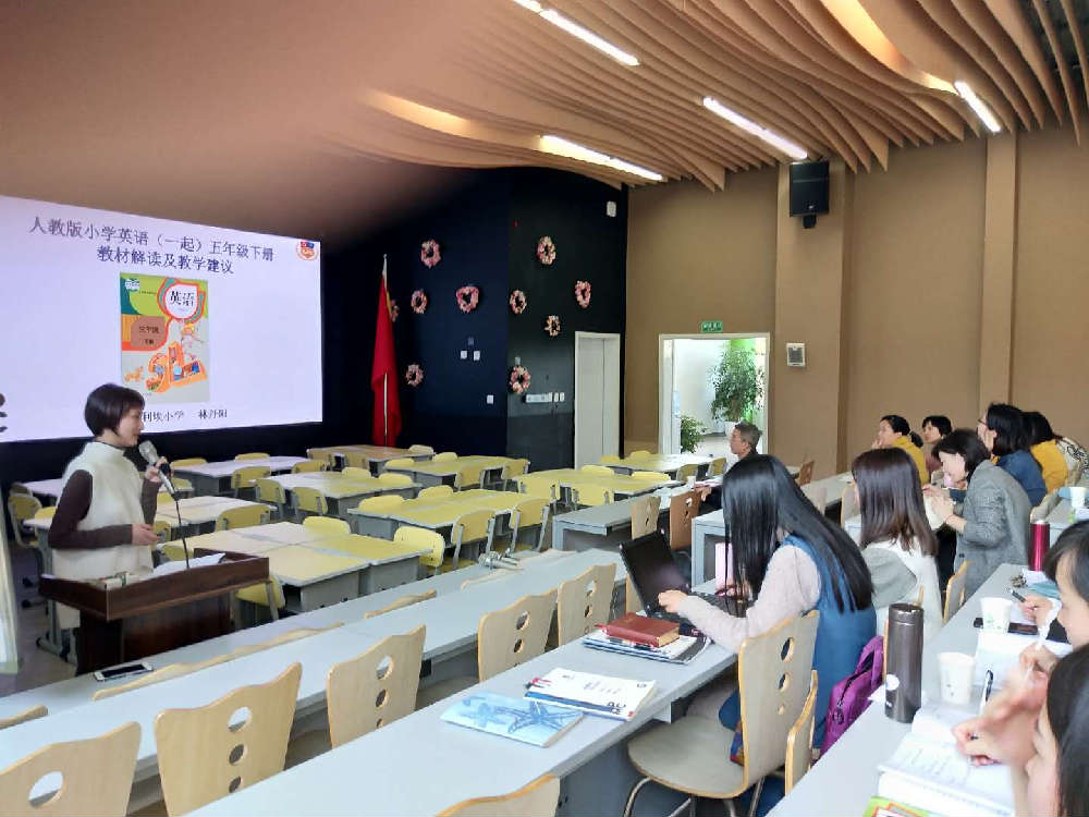 2019年3月28日下午14时,在成都蒙彼利埃小学的阶梯教室举行了高新区小学英语高段集中教材培训活动。首先是蒙小的林丹阳老师解读了五年级的教材。