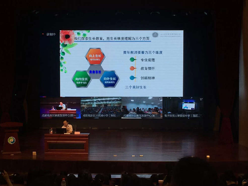 成都高新实验小学朱祥烈校长将教师的成长分为三个维度:向内的培育学习力,向外的培育教育力和向上的培育创新力,以学校教师的实际案例使在座新教师对教师职业有了生动的理解。