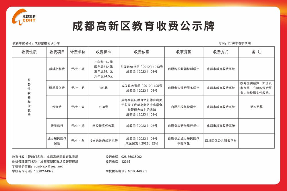 成都蒙彼利埃小学2026年春季教育收费公示牌